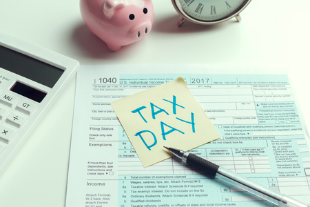 Calendar on top of form 1040 income tax form for 2017 showing tax day for filing is April 17 2018
