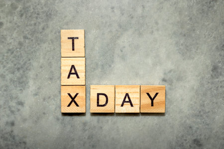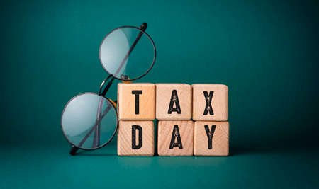 Close-up view of wooden cubes with TAX DAY letters. Financial concept