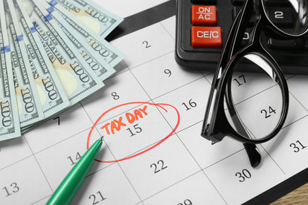 Tax Day on monthly Calendar and marked 15th isolated on office desk