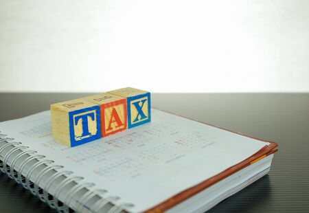 Miniature people siting on grid and blocks with the word TAX. The concept of wait to pay annual income (TAX) for the year.