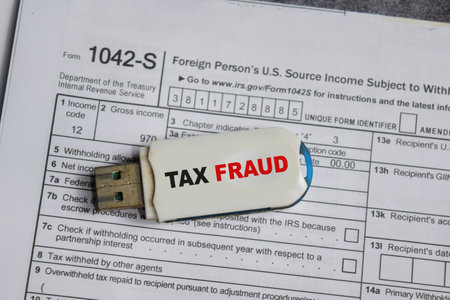 USB drive with text tax fraud and tax form. Business and finance concept
