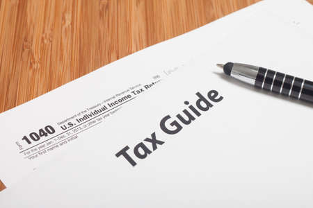 Wooden cubes with the word tax with US Income Tax Return forms 1040 to complete your tax legal, financial payment Profit and investment taxation to the government on behalf of a company or individual.