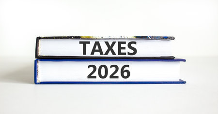Taxes 2026 new year symbol. Concept words Taxes 2026 on beautiful books. Beautiful white paper background. Business and taxes 2026 new year concept. Copy space.