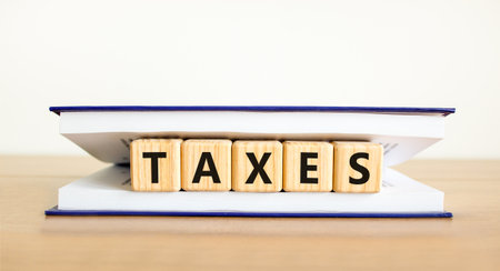 Taxes symbol. Concept word Taxes on beautiful wooden blocks in book. Beautiful wooden table white background. Business lifestyle taxes concept. Copy space.