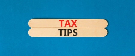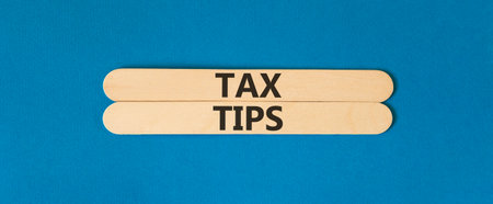 Tax tips symbol. Concept word Tax tips on beautiful wooden sticks. Beautiful blue paper background. Business tax tips concept. Copy space.