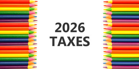2026 taxes new year symbol. Concept words 2026 taxes on beautiful white paper. Beautiful white paper background. Beautiful colored pencils. Business and 2026 taxes new year concept. Copy space.
