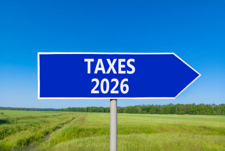Taxes 2026 new year symbol. Concept words Taxes 2026 on beautiful blue road sign. Beautiful green grass field forest and blue sky background. Business and taxes 2026 new year concept. Copy space.