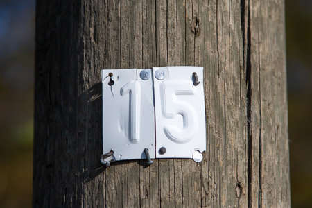 Sheet metal with the number 15 on a wooden mast, outdoors