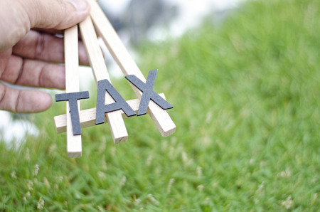 blurred image of cropped hand image holding wooden stand with alphabet tax