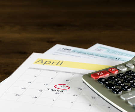 Tax day. 1040 form and calculator on table ready to be filled and returned.