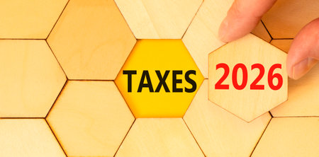 Taxes 2026 new year symbol. Concept words Taxes 2026 on beautiful wooden puzzles. Beautiful wooden puzzles background. Businessman's hand. Business and taxes 2026 new year concept. Copy space.