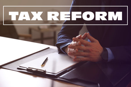 On the desktop there are reports, notepads, a calculator, a cash and a red sticker with the text TAX REFORM. Business concept