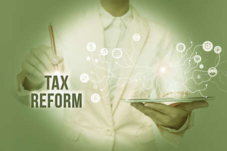 Text sign showing Tax Reform. Concept meaning government policy about the collection of taxes with business owners Lady In Uniform Standing And Holding Tablet Showing Futuristic Technology.