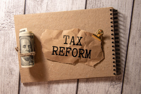 A clipboard with the word tax reform written on it. The clipboard is on a wooden surface. The clipboard is open and has a clip on it
