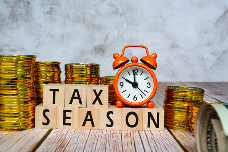 Blocks spelling tax season on an open notebook surrounded by a calculator, pen, and various financial documents on a wooden desk, representing income calculating and accounting