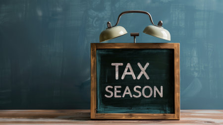 Chalkboard with TAX SEASON sign on desk. Tax preparation and financial organization.