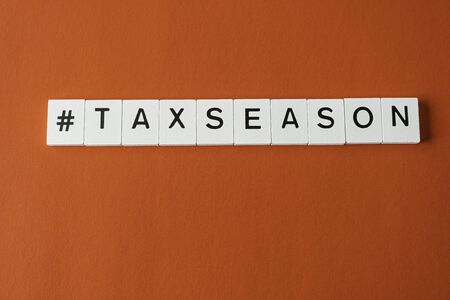 Miniature people siting on grid and blocks with the word TAX. The concept of wait to pay annual income (TAX) for the year.