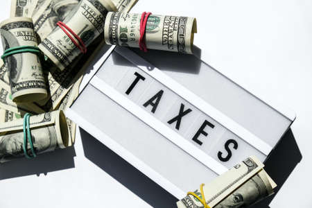 Lightbox board with word TAXES in black letters around Us dollars banknotes. Tax payment and filing concept. Money, Business, finance, investment, saving and corruption. Cash bill