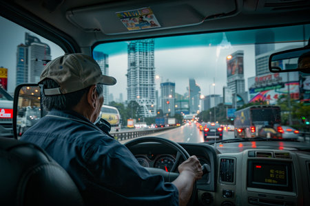 Truck driver on highway with urban skyline a day in the life of a transport service worker