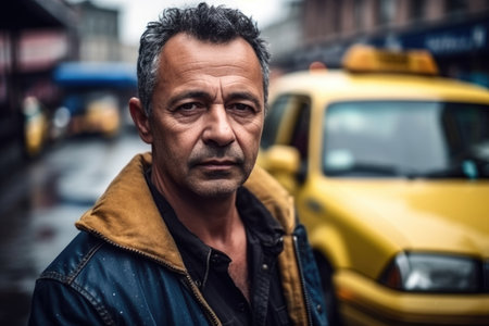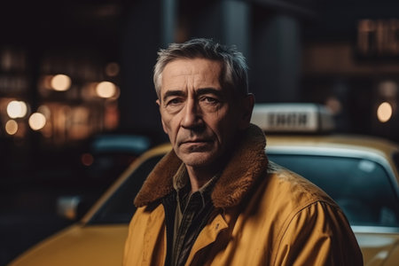 portrait of mature man in yellow coat looking at camera while standing in taxi