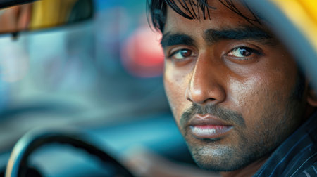 Close-up portrait of a young Indian male taxi driver with a friendly expression, sitting in the driver's seat of a taxi.