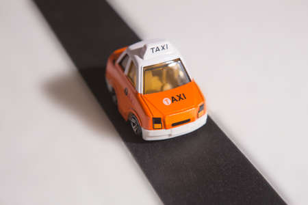 Toy car moves along the road. Concept of transport services.