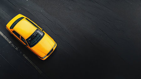 A striking top view of a yellow taxi sitting on a dark asphalt road, featuring ample blank space for creative text or design overlays. Perfect for urban-themed projects.