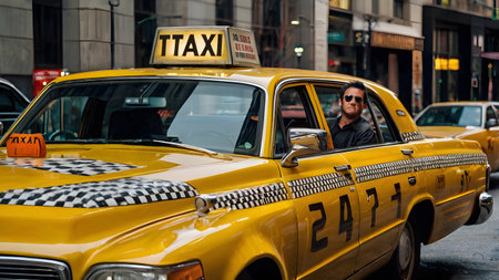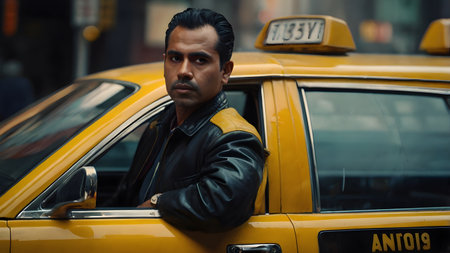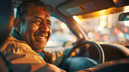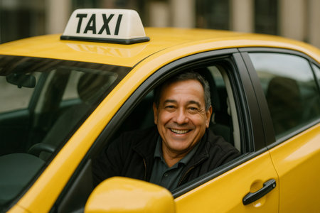 male taxi driver with a beaming smile and an optimistic gaze looks out from the window of his bright yellow cab on bustling city street