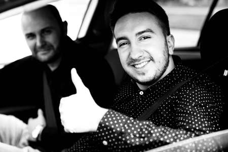 Handsome smiling man driving a luxury car in an urban setting with city lights glowing. Concept of style, confidence, and success.
