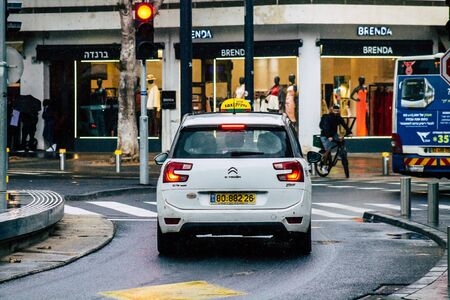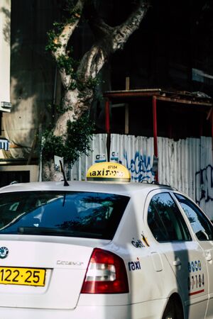 Tel Aviv Israel December 07, 2019 View of traditional Israeli taxi rolling in the streets of Tel Aviv in the afternoon