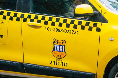 Budapest Hungary july 20, 2020 View of a traditional yellow Hungarian taxi for passengers driving through the streets of Budapest the capital and the most populous city of Hungary