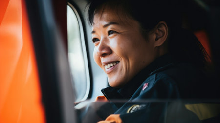 Asian emergency responder in an ambulance, urgency in a life-saving scenario.