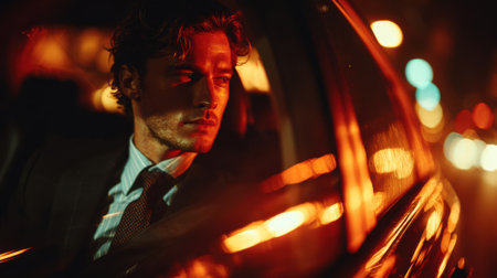 A man gazes thoughtfully from a car window, with blurred city lights in the background, creating a moody atmosphere.