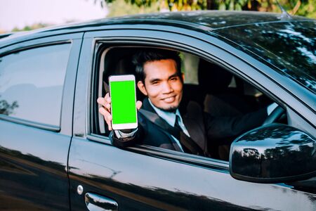Man holding mobile smartphone showing on phone screen and sitting car