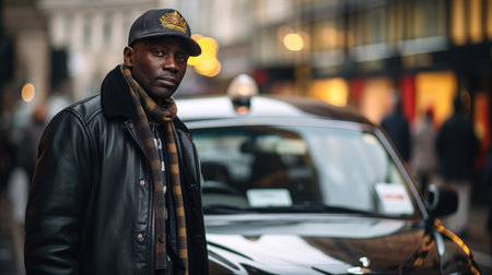 Handsome african american taxi driver near car on city street