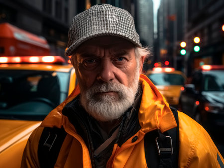 portrait of senior man with gray beard in yellow raincoat and cap on street. Generative AI
