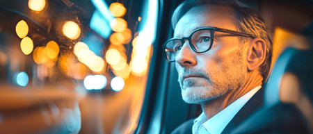 An older man in a suit and glasses looks thoughtfully out of a train window, admiring the sparkling city lights as he travels through the night.