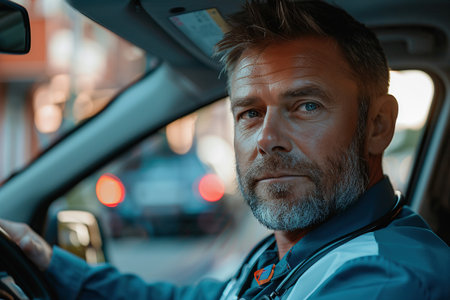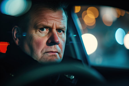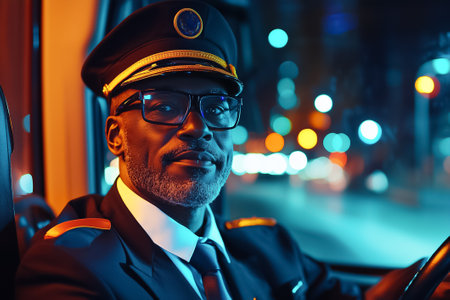 A seasoned bus driver sits confidently at the wheel, framed by urban lights highlighting his composed demeanor.