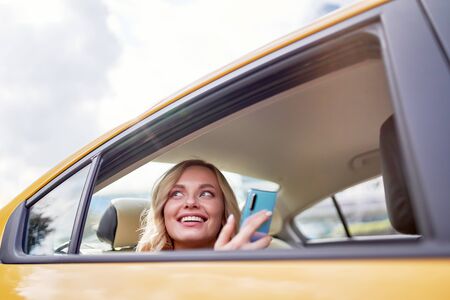 Photo of happy blonde looking at side with phone in her hand sitting in back seat in yellow taxi
