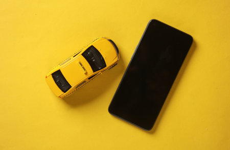 Toy taxi car model with smartphone on yellow background. Top view