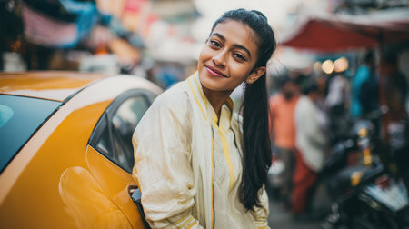 A young woman with black hair in a ponytail leans against her charging electric car on a busy market street. She wears a cream kurta and modern jacket, embodying a blend of tradition and modernity.