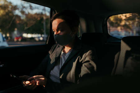 Businesswoman typing text message in car while wearing protective face mask for Covid-19 pandemic, selective focus