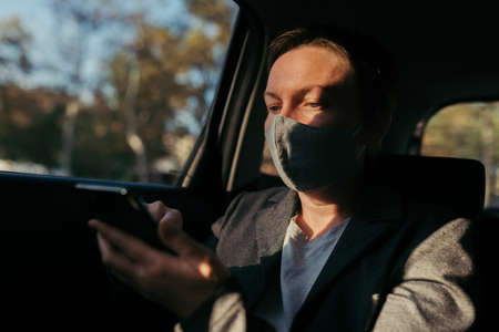 Bald man businessman in medical face mask using tablet mobile phone inside yellow car taxi. Concept of coronavirus quarantine