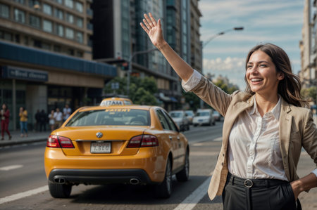 Portrait of happy brunette businessman stopping a taxi with a hand gesture in city. A woman is waving at a taxi driver