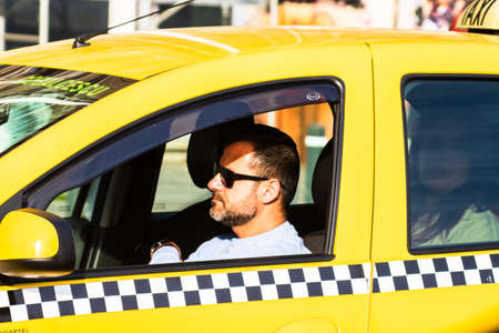 Athens Greece September 7, 2019 View of Greek yellow taxi driving through the streets of Athens in the morning