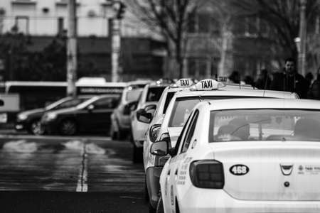 Car in traffic, modern city taxi service. Detail of taxi driver in traffic jam in the capital city of Bucharest, Romania, 2020