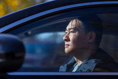 A pensive Asian man is sitting in the car, the driver is waiting and sad
