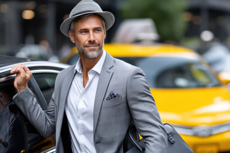 A man in a gray suit and has confidently exits a vehicle next to a taxi in a lively city street.