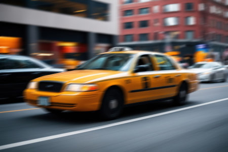 A taxi blurred in motion on a city street, conveying the dynamics and rhythm of city life in an urban landscape.