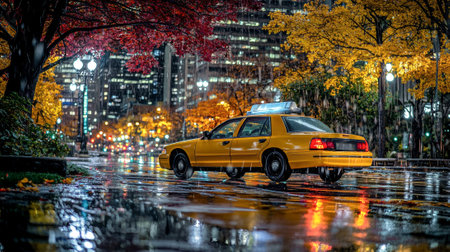 Glimmering puddles mirror neon glows as a vibrant yellow cab pauses along a damp urban avenue, capturing the city's lively after-rain atmosphere.
